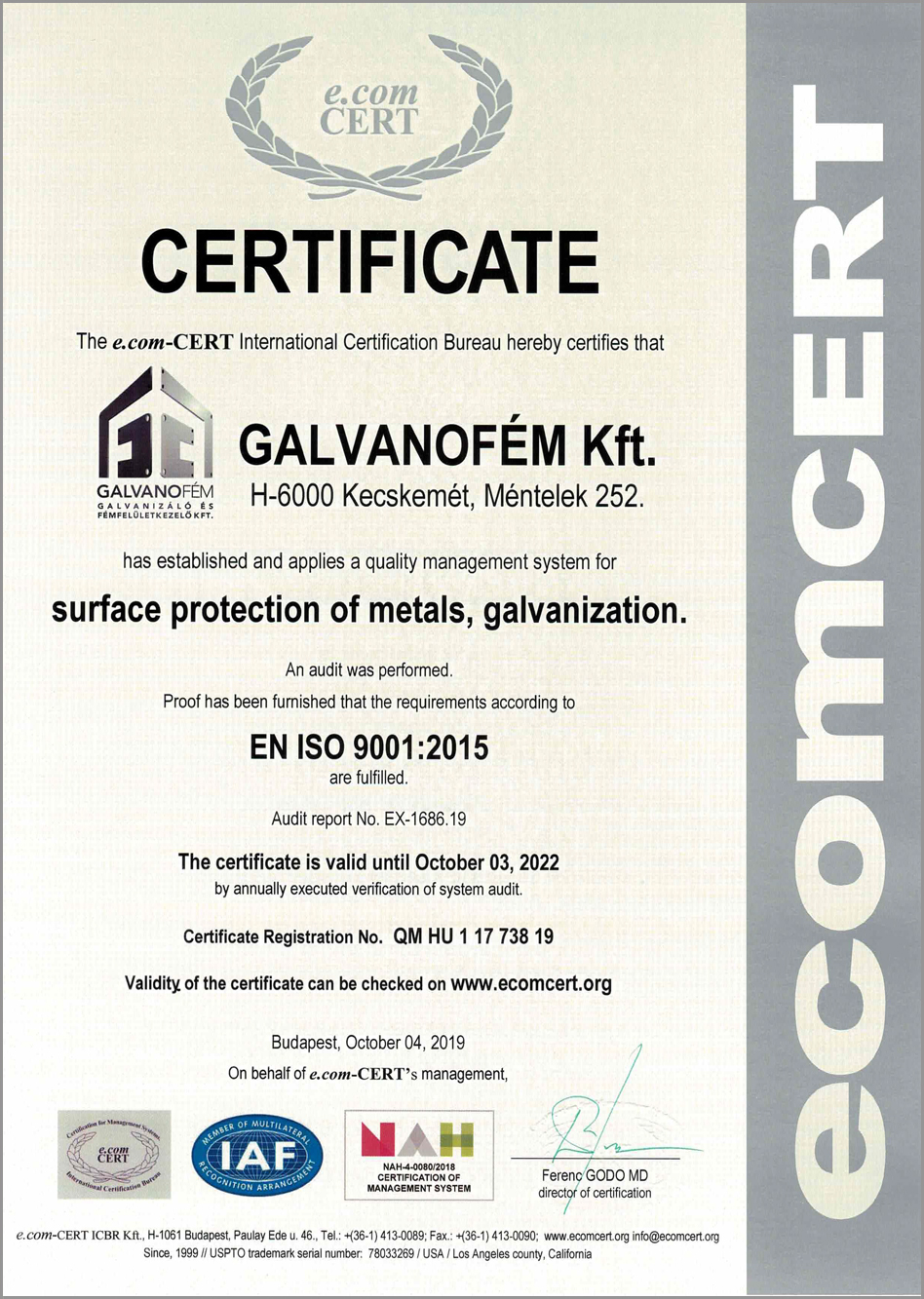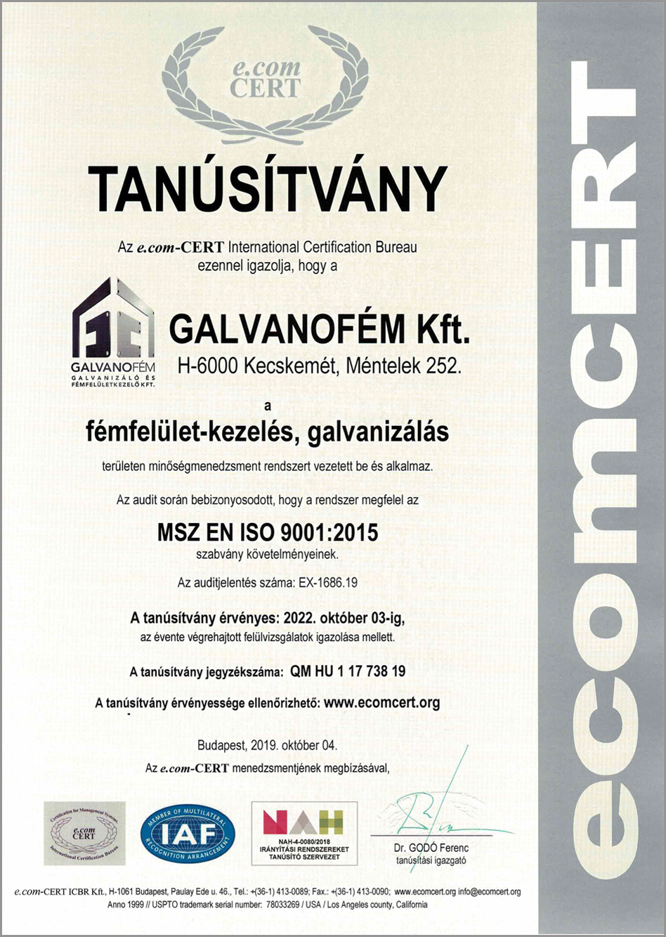 A GALVANOFÉM KFT. vezetőségének meggyőződése, hogy a minőség a társasági működés meghatározó eleme. A továbbiakban ezért a Társaság, egy olyan hatékony minőségirányítási rendszert tart fenn, és a folyamatos fejlesztések mellett működtet, amely a követelmények teljesülése által garantálja a termékeinek és szolgáltatásainak állandó kifogástalan minőségét, és vevőinek megelégedettségét. A GALVANOFÉM KFT. 2006 óta folyamatosan ISO 9001 tanúsítvánnyal rendelkezik. A társaság üzletpolitikája: megfelelni az MSZ EN ISO 9001:2015 minőségirányítási rendszer szabvány előírásainak és a speciális vevői igényeknek.